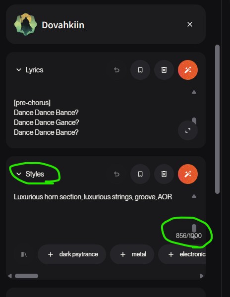 …と言うか、ここに800文字も書き込めるバカモノ(バケモノ?)って一体どんだけ居るのか?www それに個人的な「アルアル」は、同じ指示も何度も書き込んじゃったりね。しかし、ここにアホのように沢山の様式とか書ける事ができれば、曲は他の人とは重ならない個性を持って行くし、実験した範囲では、ここに書き込む指示が少ないほどどれも似たりよったりの曲にしかならない傾向があるような。