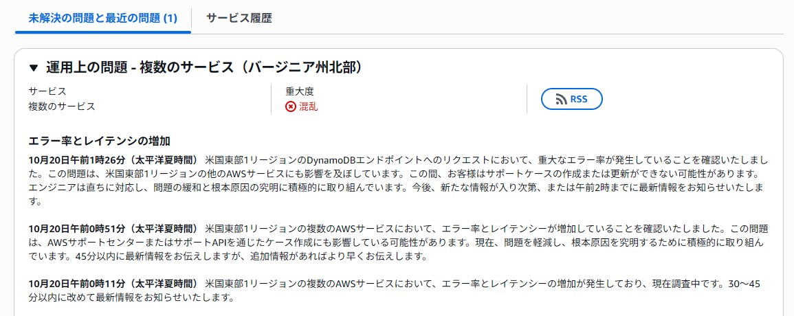 突然、Suno AIの接続が悪くなって、調べたところ、アマゾンのAWSで障害が起きていて、それを使用しているサービスは軒並み通信状態が悪くなったり動作が重い状態が続いているようです。確か、ESOもAWSを使用しているはずで、今ゲームには居ないので影響があるのかないのかわからないですが(あとで確認してきます)、こういうアマゾン由来の不具合が世界的に発生している可能性があることは知っておいて下さい。