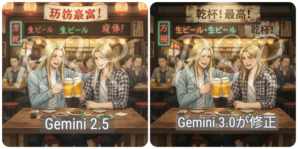 と言うのは、Nano pro(3.0)での環境では日本語は正しいからそれでも良い。しかし、どういうワケか、その特性がデタラメな日本語を書く2.5においてまで強化されていて… もっと正しく言えば、今までもGeminiの絵師は文字をすぐに入れたがる傾向が高かったけど、3.0以降はその傾向が更に強化され、2.5にでさえ絵を頼む度に毎回文字が入って来る始末。