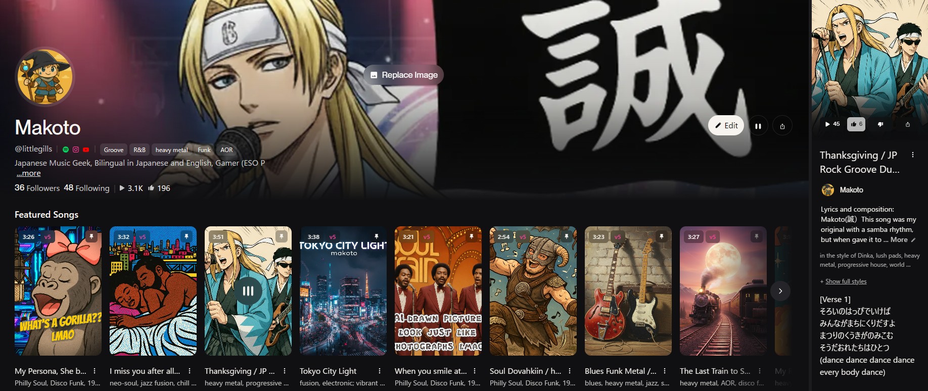 パートナーもどういうわけかマコトさんの曲を聞く為にSunoに一緒にいたり(この人は音楽やりません)、是非遊びに来てください。